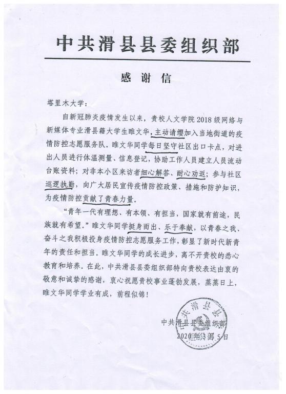 “睢文华同学挺身而出、乐于奉献,以青春之我、奋斗之我积极投身疫情防控志愿服务工作,彰显了新时代新青年的责任和担当。”4月23日塔里木大学收到来自河南安阳市滑县县委组织部发来的一封感谢信。在这场没有硝烟的疫情防控阻击战中,从党员干部到普通群众再到志愿者,都积极投身这场人民战争中,为疫情防控贡献自己的力量。