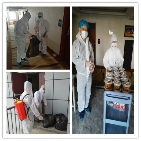 为做好学生返校工作,从4月22日开始,在良友酒店工作组组长陶大勇老师忙前忙后,不断与酒店、餐厅沟通,统计上报数据……,小组成员贺建忠老师、陈荣老师负责学生入住登记、信息统计、楼道消毒、物品发放、饭菜运送和垃圾回收等工作。