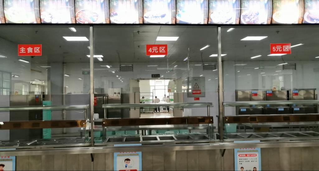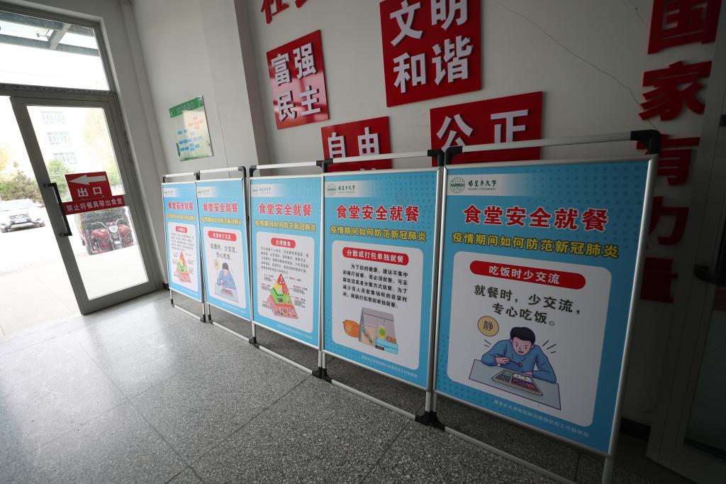 “合理膳食”“吃饭时少交流”“分散或打包单独就餐”……走进西区四号食堂,随处可见食堂安全就餐宣传栏,提示师生们如何防控疫情。