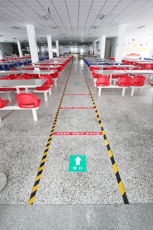 “单向排队,间隔1米,保持距离”。餐厅各通道、售卖间,地上每隔一米就有一个提示条,提醒师生打饭排队保持一定距离。
