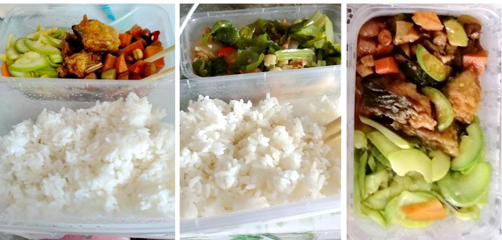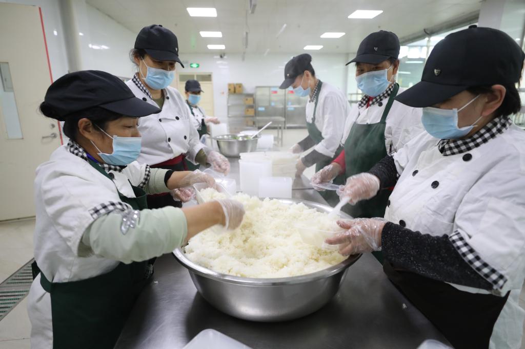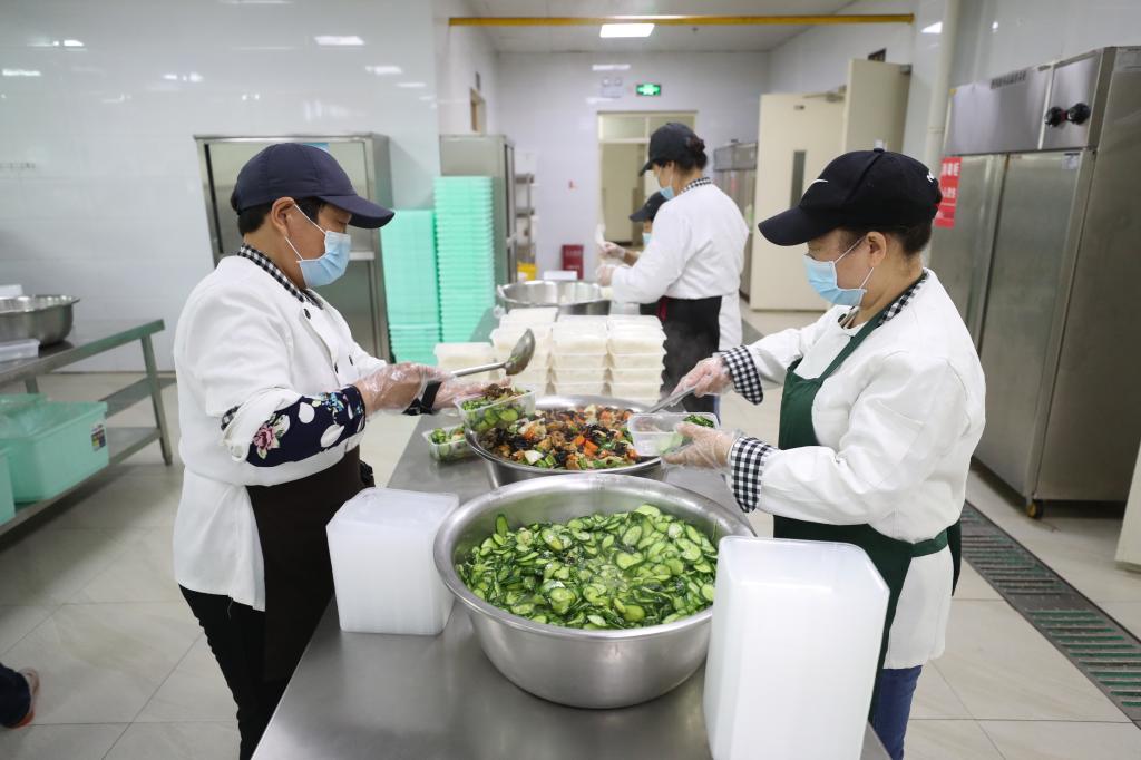 装饭、盛菜、扣盖、码整齐、打包、装袋、装箱、运送。菜炒好、饭蒸好、保质保量,采取流水线作业、登记时间、快速运送,食堂工作人员和志愿者每天竭尽全力保障配餐送餐。