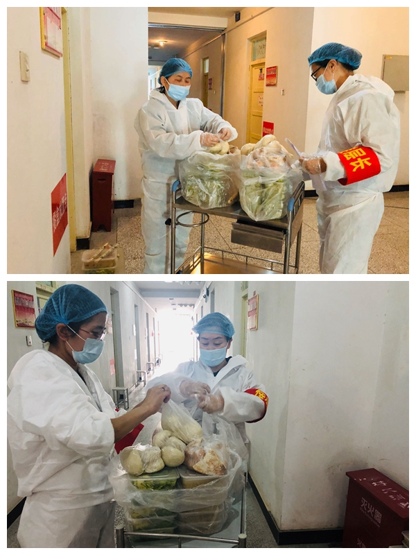 “别看我们一天做的工作不复杂,但就这些简单的事情,做起来也非常辛苦。就拿送餐来说,我负责的楼层在四楼,现在有65名同学,每次我们都要把餐盒从一楼搬到四楼,学生吃完饭还要收拾饭盒。穿上防护服,送完一餐或收完一次垃圾,至少要花一个多小时,整个人汗流浃背。常常等送完餐我们再吃饭时,饭菜早已经凉了。” 植科院东区学生11号楼楼层长王志贤老师说。(文/郝海婷 摄/赵书珍 王志贤 任洁)