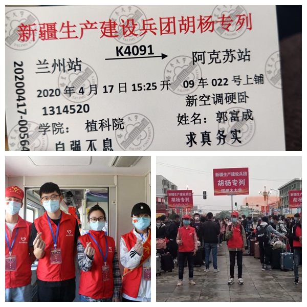 4月15日,我接到了学校的返校通知。那一刻,我欣喜若狂,终于可以回到学校,见到我的老师和同学们。学校为了保证我们疫情期间能顺利安全地返校,安排专列让我们回校。4月17日,第一趟K4091兵团胡杨专列从兰州出发,接回了我们1086名胡杨学子,在途中有老师为我们保驾护航,有志愿者为我们服务。