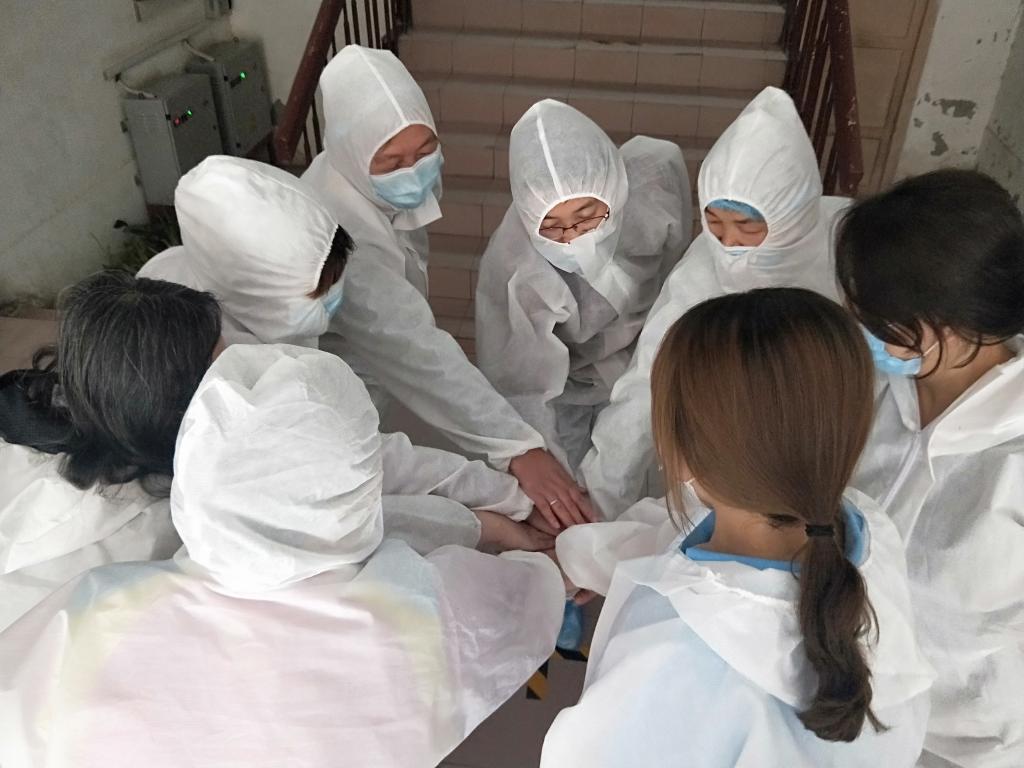 保洁员每天早上六点多就起床,负责四个楼层的卫生清洁和通风消杀,还要打扫楼前的卫生。她还给老师们讲解口罩、手套、防护服、防护眼罩、胶鞋的穿脱动作要求,还介绍了84消毒液、消毒片、免洗手液的用法。