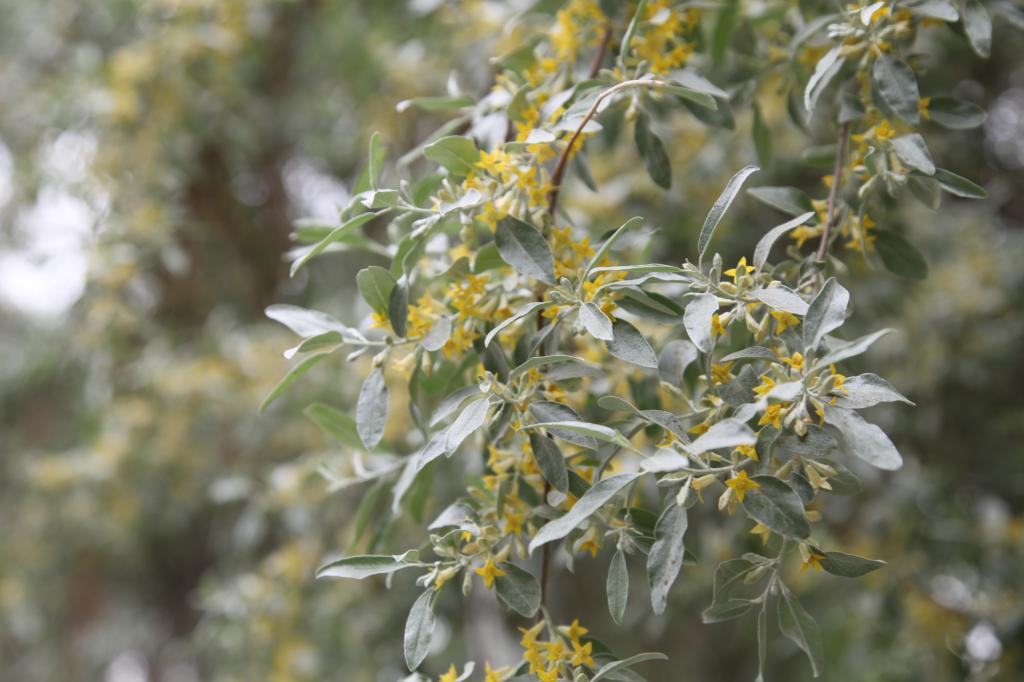 沙枣树的花香令人精神振奋,树叶柔和而朴实,黄色小花耀眼夺目,果硕枝垂竞折腰。
