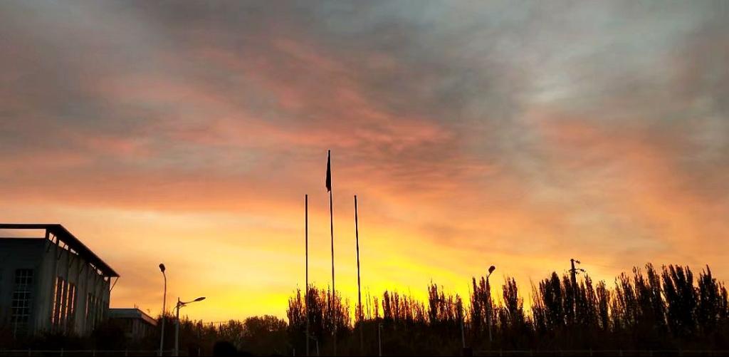 晚霞慢慢铺满天空,卷着残云,不断变换着形态。在日落红的衬托下,绚丽的晚霞是如此的烂漫。晚霞徐徐拉开柔软的帷幕,整个校园豁然开朗。晚霞散去,夜幕随之降临。