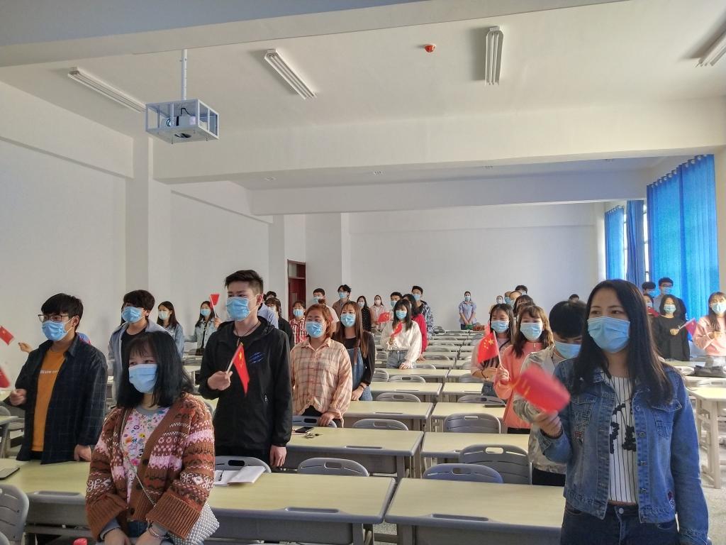 民语言2019级刘鸿说:“开学第一课,让我们吃了一颗定心丸。大家虽然单人单桌,但当我们一起手拿着小红旗唱歌时,才发现如此亲近,这四个月我们仿佛从未离开过。”(文/张玫林润 摄/张磊述 刘琳 韩亚杰)