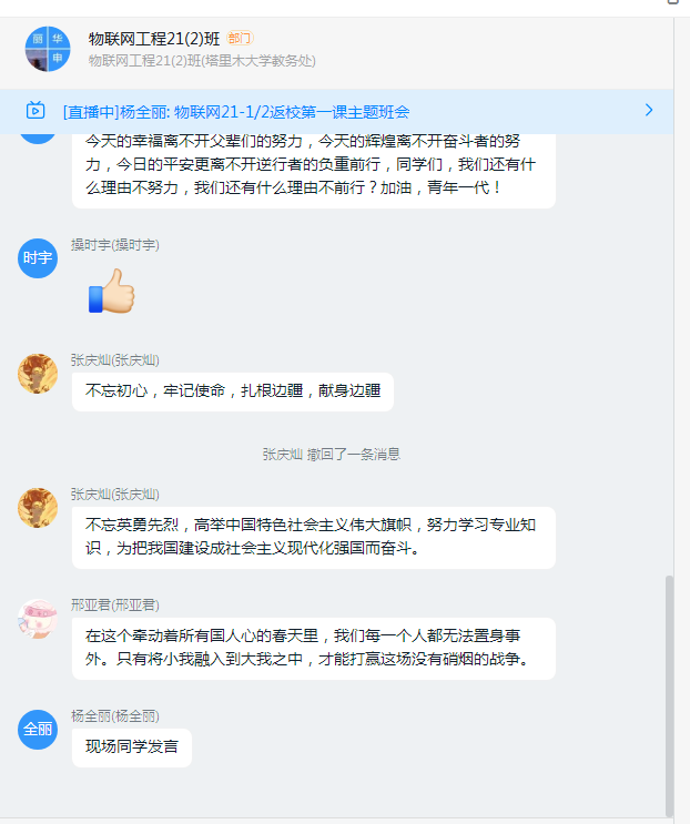 史哲院党总支书记姚江军说:“在这场‘战疫’中,展现了中国力量、中国效率和中国精神,也展现了我们塔大人的责任担当。我们要在学校党委的坚强领导下,坚持不懈,同心协力,落实落细疫情常态化防控措施,扎实做好复学复和疫情防控工作”。