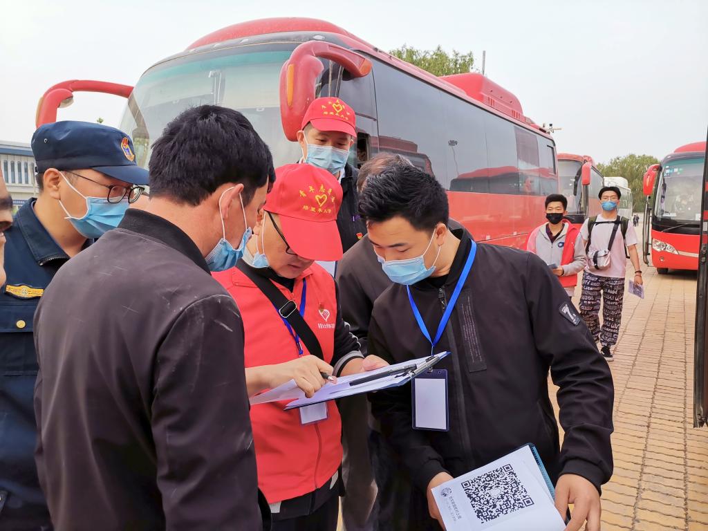 “口罩戴好,注意安全,乘坐指定的专车。”接站工作队时刻提醒学生遵守纪律,做好个人防护。