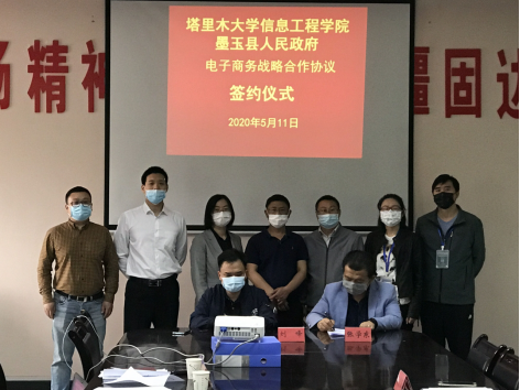 5月11日塔里木大学信息工程学院与墨玉县人民政府签订电子商务战略合作协议,为墨玉县农村电商发展提供电商技术、人才培养与智力支持。墨玉县委常委、副县长刘峰,墨玉县商工信局书记舒畅、商工信局副局长胡志芳,信息工程学院副院长张学东,塔里木大学“淘万家”电商团队王涛、高贤强和邬欢欢参加签约仪式。