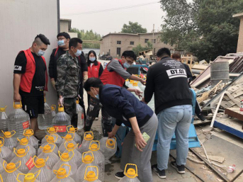 王鹏飞在搬运消毒液(右一)