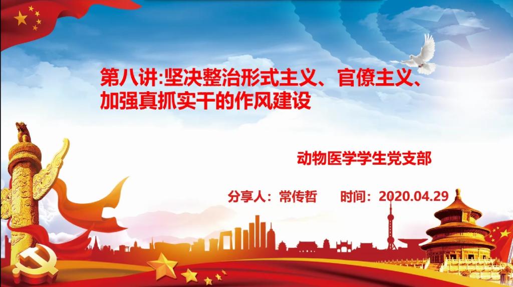 为进一步增强党员意识,加强党性锻炼,改进工作作风,打造有高度、有温度的党支部。5月13日下午,动物医学学生党支部开展线上学习会,支部党员常传哲领学了《习近平关于"不忘初心,牢记使命"论述摘编》第八讲,李雷芬分享了小说《狼王梦》读书体会。