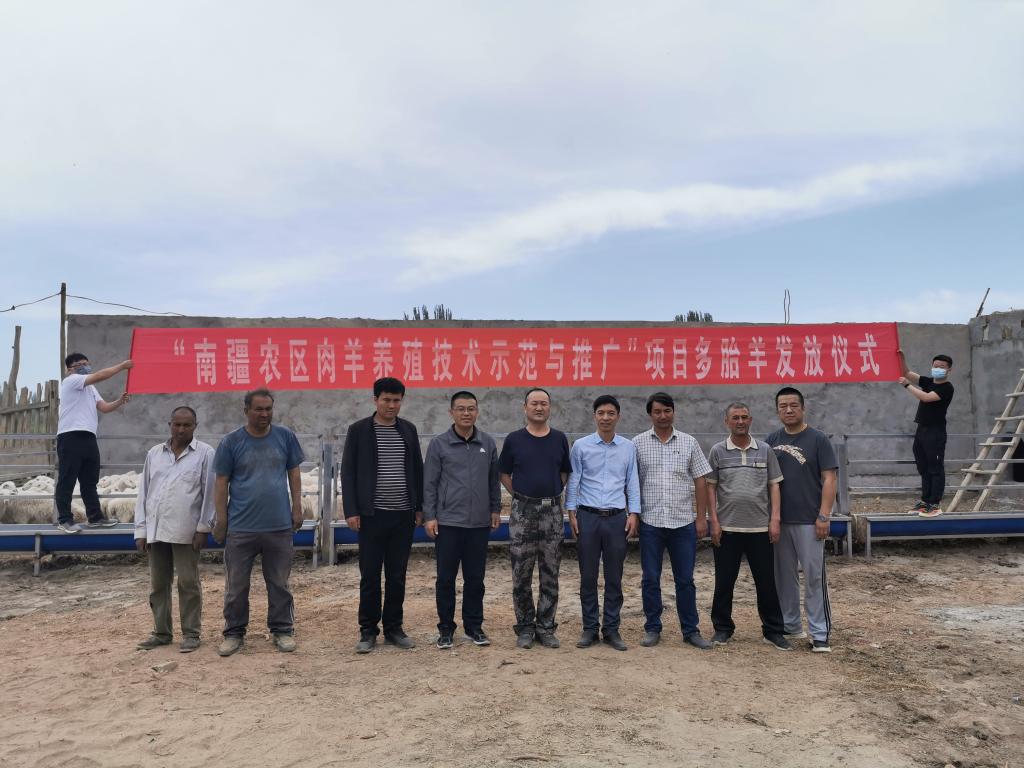 5月22日,兵团科协“南疆农区肉羊高效养殖技术示范与推广”项目多胎羊发放仪式,在阿克苏市喀拉塔勒镇托万克阿勒迪尔村举行。兵团科技局农业科技处(社会发展科技处)处长脱东峰、塔里木大学科技处副处长高山、项目主持人动物科学学院许贵善、托万克阿勒迪尔村“访惠聚”工作队,村民代表共30余人参加了发放仪式。