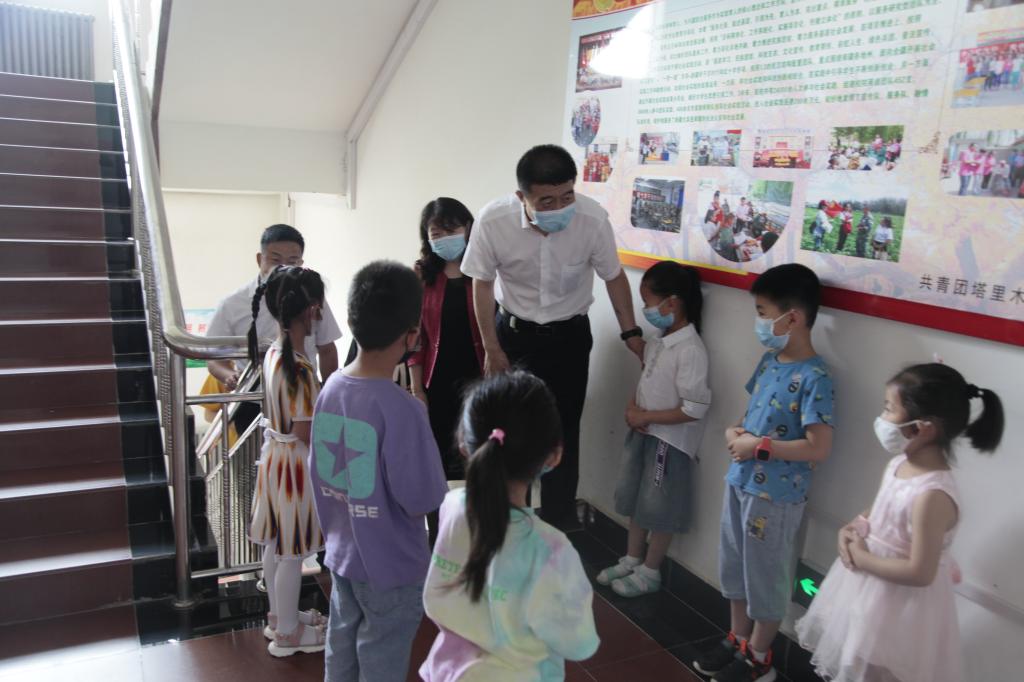 校领导与幼儿园教职员工和小朋友们亲切交流,了解大家的工作情况、小朋友们的学习生活情况。叮嘱幼儿教师要落实常态化疫情防控措施,确保孩子们的安全健康。要持续用胡杨精神育人,教育引导孩子们扣好人生第一粒扣子,刻苦学习知识,坚定理想信念,磨练坚强意志,锻练强健体魄,为实现新疆工作总目标、实现中华民族伟大复兴的中国梦时刻准备着。叮嘱各部门和各学院都要关心关爱孩子们,为孩子们茁壮成长创造有利条件。提醒小朋友们要勤洗手、戴口罩,养成良好的学习生活习惯。