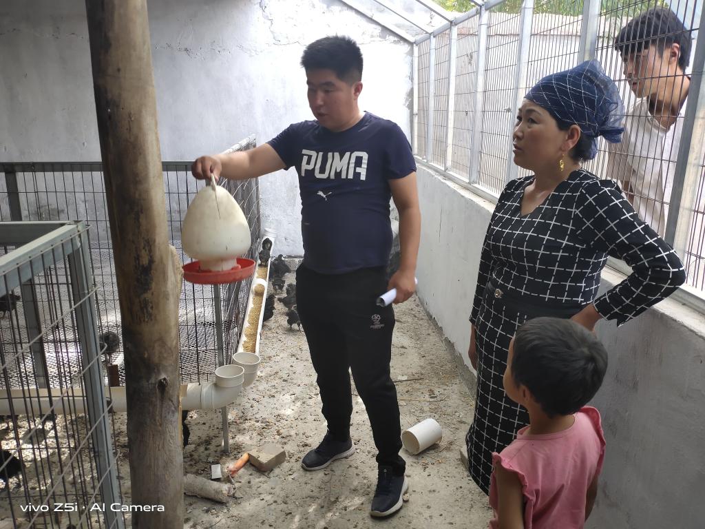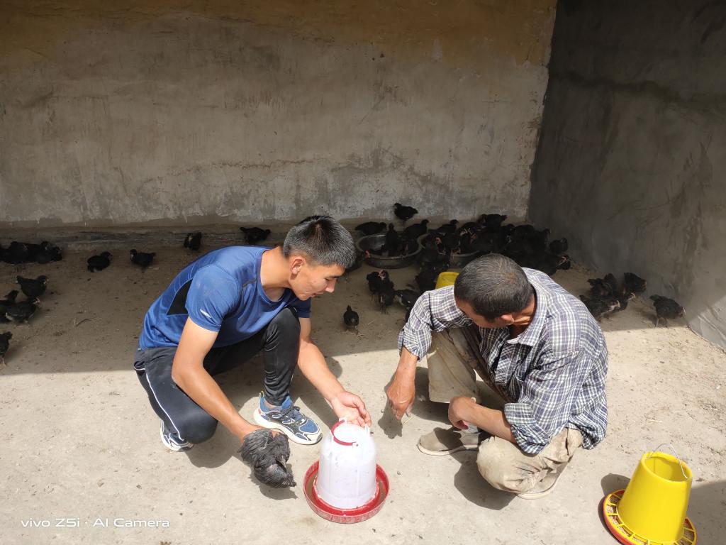 本次发放鸡苗共计5000多羽,对该镇16大队通过前期养殖条件筛选出的22户农户进行了鸡苗和饲养管理书籍发放,每户领取饲养管理书籍一本和约150-200羽鸡苗不等。为解除农户担忧鸡苗饲养管理出现的顾虑,服务团队安排动科20-1班的居马别克·阿曼太和昂沙尔·吾肯两名同学蹲点技术服务1个月,同时对大队2名村级疾病防疫技术人员进行技术培训。