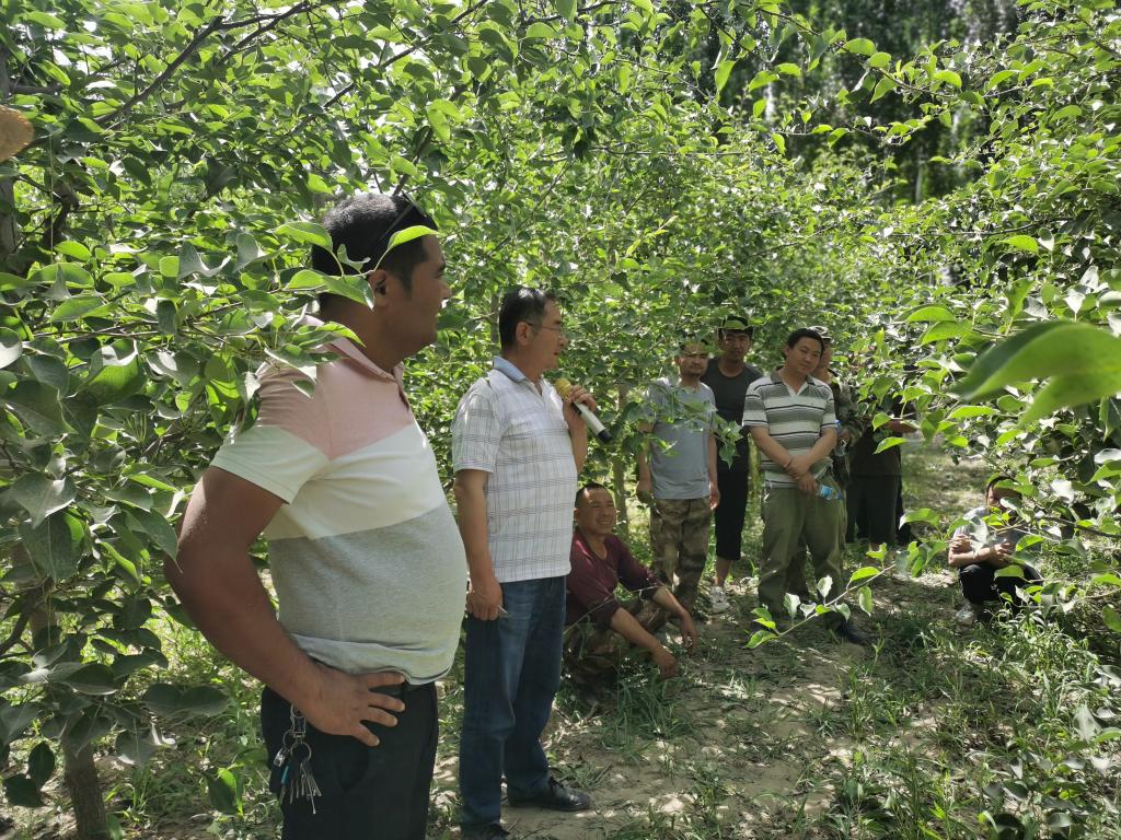 眼下正值梨树夏季管理黄金期,为切实发挥科技特派员科技兴梨、强梨作用,助推乡村振兴战略实施,2020年6月5日-7日,我校“香梨提质增效”兵团科技特派员服务团队张琦教授、包建平副教授对第三师53团20连、21连、22连和良种连的主干形香梨进行夏季修剪、果实膨大、花芽分化期水肥管理、果园自然生草覆盖和香梨枝枯病预防等工作开展培训服务。