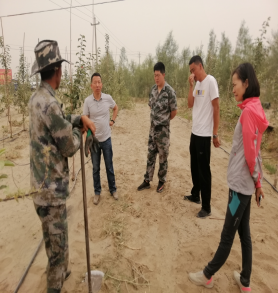 王江波一行对54团苹果树生长现状进行实地调查,结合当地土壤及灌溉情况,对苹果的肥水管理及当前病害关键防控等技术方面进行了讲解,对农户管理中存在的问题进行了详细解答,并有针对性地就苹果幼树存在的病虫害等问题进行了指导。