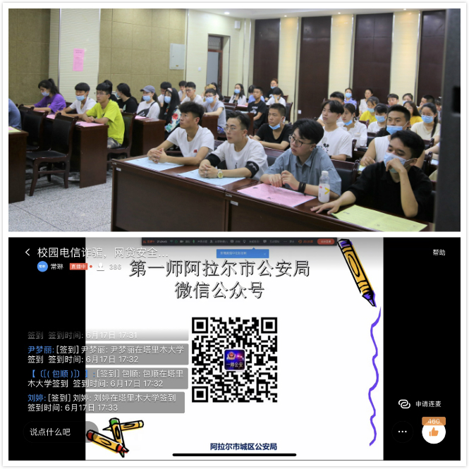 6月17日,动科院在动科楼218室通过线上线下相结合的形式,开展“预防网络电信诈骗,提高安全防范意识”专题教育讲座。邀请阿拉尔市公安局民警赵小龙作讲座,阿拉尔市公安局民警海尼古丽·卡斯木,大学路派出所民,各班团支书,生活委员现场参加,学院学生在钉钉平台上听讲座。讲座由辅导员常琳主持。