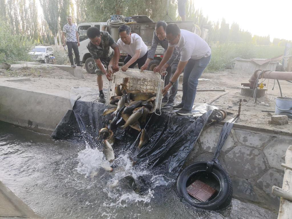 任道全边将鱼苗倒入鱼塘边高兴地说:“我们的服务是长效的,不仅带来致富鱼,还要指导连队职工群众养殖技术。授之以鱼,更要授之以渔,小康路上我们都是同行者,后期我们还有更多的品种要投放过来,在养殖、防疫、捕捞等方面还有很多技术指导,让老百姓从单一的生产模式中解放出来,让多元增收带给他们更多的实惠和收益!”