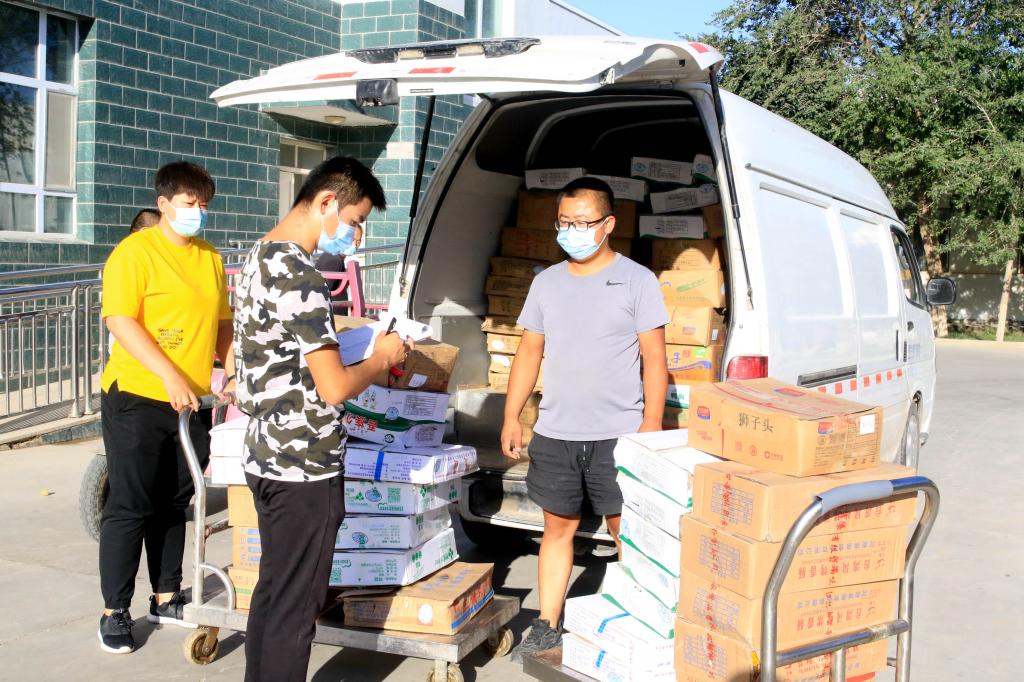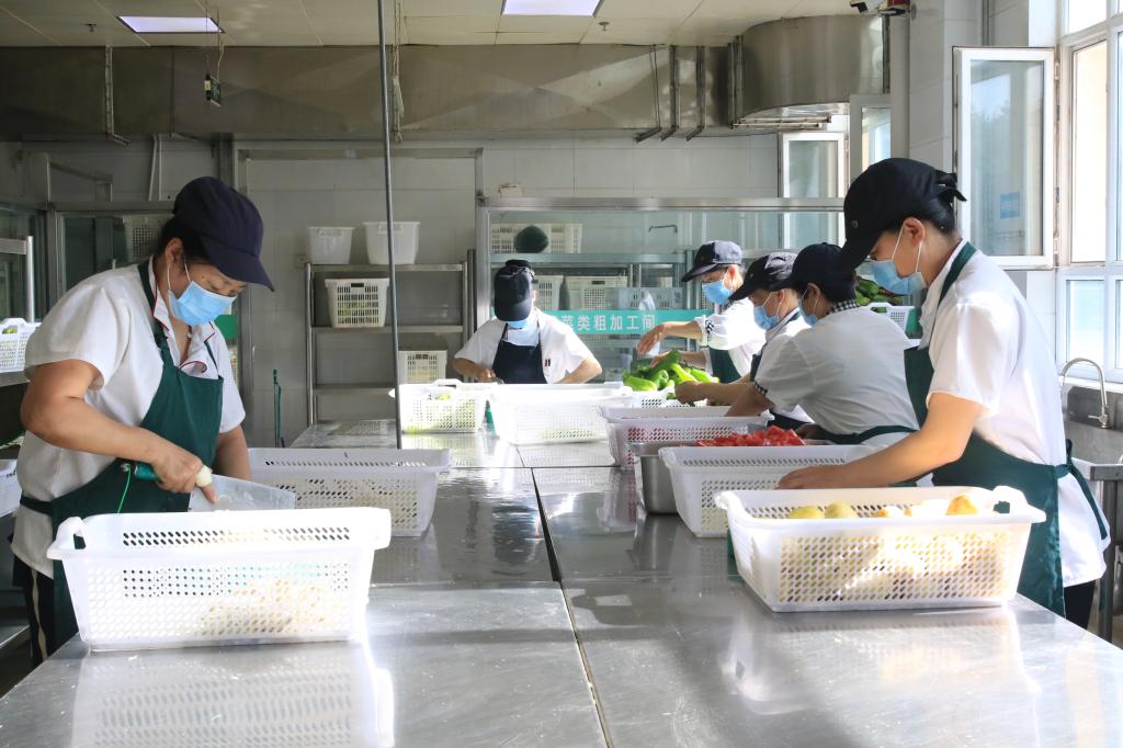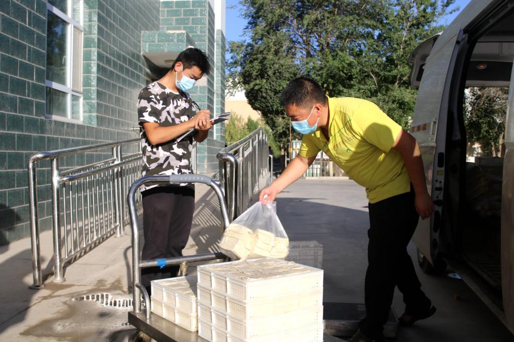 一辆装满蔬菜的货车驶到西区2号食堂侧面,开始卸各种各样的新鲜蔬菜,餐厅经理和保管测量供应商体温,对每种蔬菜详细进行核对、质检、登记、过称、签收及发放。食堂所有供应商送来的每种物资均按照此种流程进入食堂,每个环节的要求又严又细,严格把控食材的质量安全关。