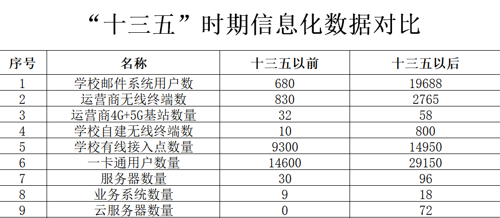 “十三五”以来,在学校领导的正确领导下,塔里木大学网络信息中心在信息网络建设上取得了显著的成就,学校有线信息点数量新增近6000个,学校自建无线终端数新增近800个,实现校园网重点公共区域的无线覆盖、有线全覆盖;运营商无线终端数近2000个,运营商4G+5G基站数量达到58个,实现校园重点区域的5G手机信号覆盖、4G信号全覆盖;网络信息中心核心机房托管服务器新增66台,新建云服务器数量72台,已实现校园服务器的集中管理;校园网站群规模持续扩大,站点数量达到84个,校园邮箱用户数新增近19000个,校园各业务系统的数量达到18个,网络在线用户数峰值可达9000人,各业务平台的投入使用为校内师生的生产、学习、生活提供了便利;校园一卡通用户数量新增近15000个,校园一卡通集成多种手机APP充值渠道,实现图书借阅、网上缴费、机房上机、会议签到、食堂就餐、自助洗衣、消费购物、门禁管理、洗浴及打开水、医疗就诊,场馆出入、学生在线缴纳电费、网费、教务扣费、自助成绩单打印等20多项应用,为全校师生员工提供了方便、快捷、规范、专业的校园卡服务;经过五年的建设,我校已经搭建了良好的信息化环境,拥有了较为完善的信息化软硬件基础设施,积累了一定的数字资源及丰富的应用,为学校“十四五”信息网络建设打下了坚实的基础。