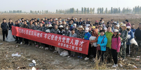 2019年10月21日,植物科学学院农学系教工党支部全体党员在温宿县棉花育种项目中单株取样、小区收获、品系田间鉴定等志愿工作。