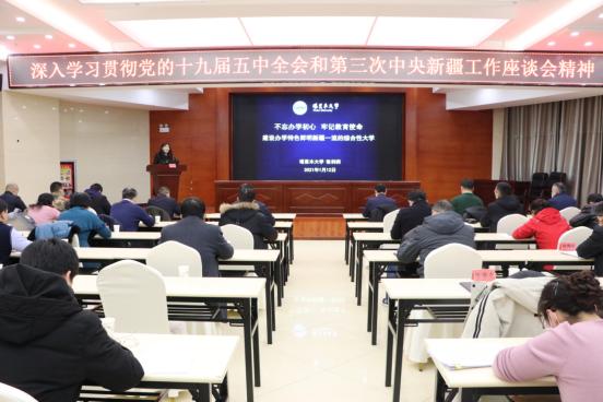 1月12日上午,副校长张利莉为学校深入学习贯彻党的十九届五中全会和第三次中央新疆工作座谈会精神领导干部专题教育培训班作讲座。讲座在南疆双语中心二楼报告厅举行。