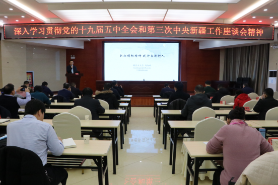 1月12日上午,党委常委、组织部部长马智群为学校深入学习贯彻党的十九届五中全会和第三次中央新疆工作座谈会精神领导干部专题教育培训班作讲座。讲座由党委组织部常务副部长张伟信主持,在南疆双语中心二楼报告厅举行。
