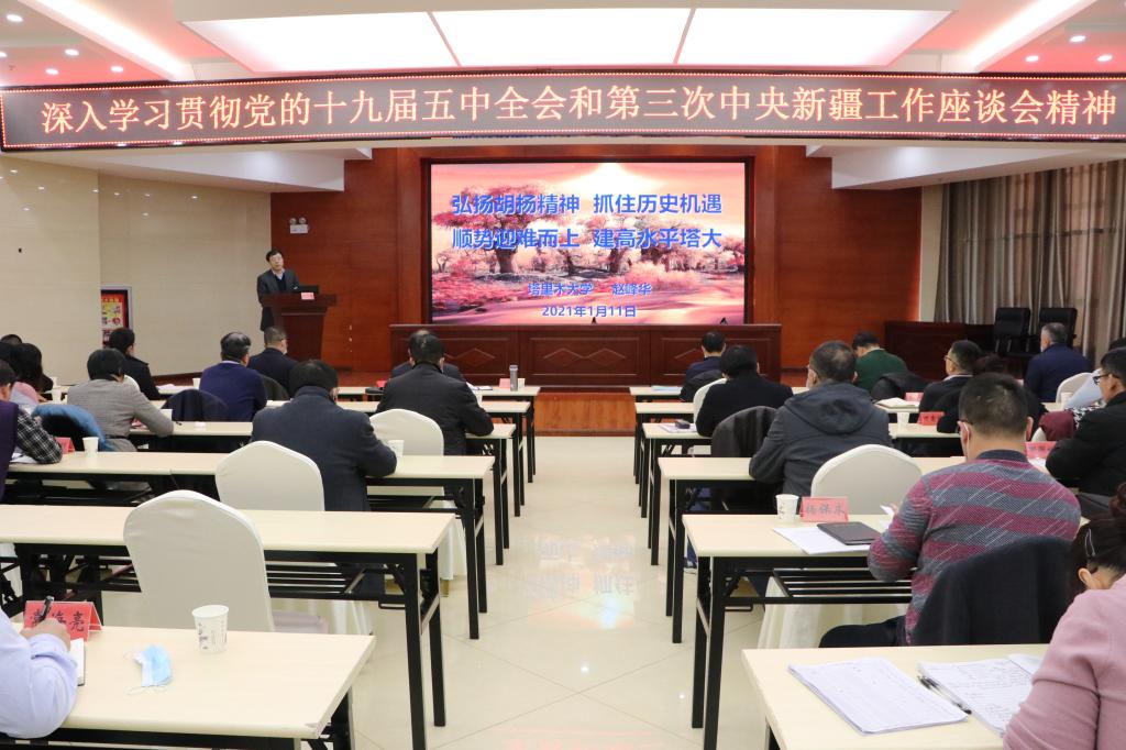 1月11日下午,党委常委、副校长赵峰华为学校深入学习贯彻党的十九届五中全会和第三次中央新疆工作座谈会精神领导干部专题教育培训班作讲座。讲座由党委组织部常务副部长张伟信主持,在南疆双语中心二楼会议厅举行。