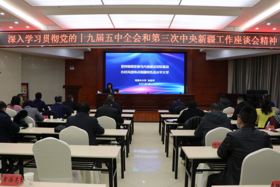 1月14日上午,党委副书记张爱萍为学校深入学习党的十九届五中全会和第三次中央新疆工作座谈会精神领导干部专题教育培训班作讲座。讲座由党委组织部常委副部长张伟信主持,在南疆双语中心二楼报告厅举行。