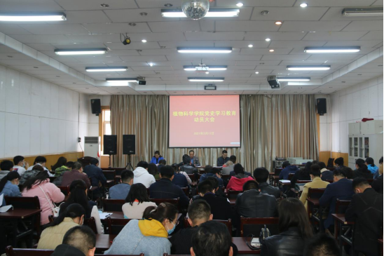 3月17日下午,植物科学学院召开党史学习教育动员会。学院党委书记蒋学玮,党委副书记、院长万素梅,党委副书记朱天生以及全体师生党员参加会议。会议由万素梅主持,在老植科楼四楼多功能报告厅举行。