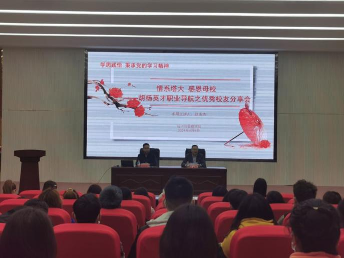 4月9日上午,经管院在文科实验楼504开展了第二期胡杨英才职业导航之优秀校友宣讲会。工商管理10届校友、新疆法同商业运营管理有限公司、阿拉尔市法同职业技能培训学校董事长、校长赵永杰为大家作宣讲。宣讲会由学院党委副书记谷建杰主持。