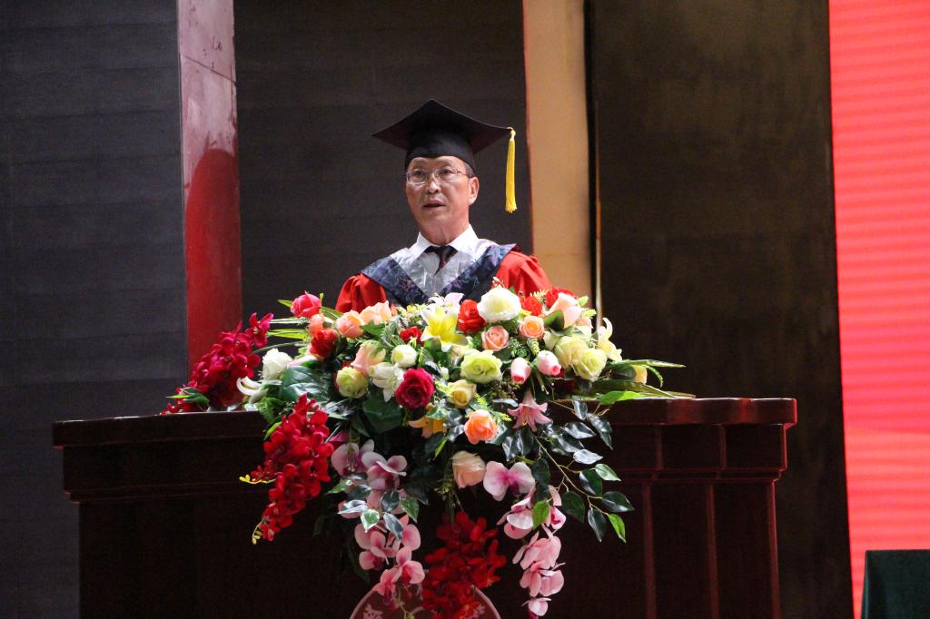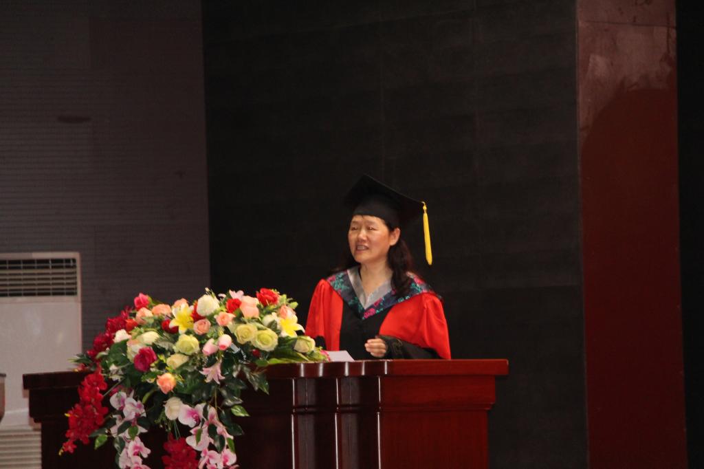 教师代表,化学化工系吴瑛教授发言,希望毕业生们牢记胡杨精神,做有新道德、新思想、新知识的青年,做对社会、对他人有用的人,创造人生的辉煌奇迹,谱写青春的绚丽篇章。