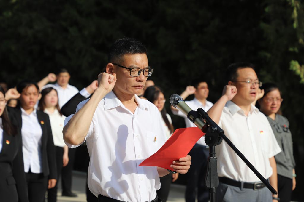 6月30日上午,经管院在红色文化广场办了“新党员入党宣誓暨老党员重温入党誓词”主题党日活动。学院党委书记田国林、党委副书记谷建杰、党委委员朱哲,以及全体在校师生党员参加。在鲜红的党旗下,学院领导及学生党支部书记为新党员佩戴党徽,田国林带领全体党员面向党旗,举起右手,握紧右拳,庄严宣誓。铿锵有力的誓言激荡着每位共产党员的心,在党旗下接受心灵的净化和洗礼。