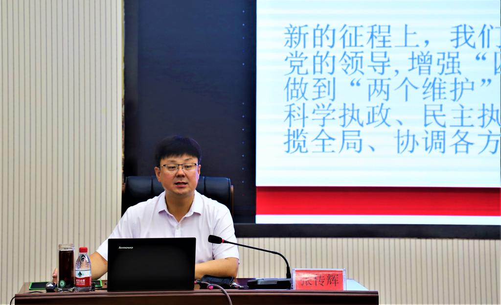 张传辉从总书记“七一”重要讲话的重大意义和重要地位、精髓和主要内容,全面学习落实总书记“七一”重要讲话精神,这三部分为师生党员进行深入辅导和讲解。他指出,习近平总书记“七一”重要讲话,贯通历史、现实、未来,高屋建瓴、思想深刻、内涵丰富,具有很强的政治性、思想性、理论性,体现了深远的战略思维、强烈的历史担当、真挚的为民情怀,是一篇马克思主义纲领性文献,是新时代中国共产党人不忘初心、牢记使命的政治宣言,是我们党团结带领人民以史为鉴、开创未来的行动指南,为全党全国各族人民向第二个百年奋斗目标迈进指明了前进方向、提供了根本遵循。在全面建设社会主义现代化国家新征程上,要高举习近平新时代中国特色社会主义思想伟大旗帜,全面学习落实习近平总书记“七一”重要讲话精神,不忘初心,牢记使命,提高政治判断力、政治领悟力、政治执行力,增强“四个意识”,坚定“四个自信”,坚决做到“两个维护”,牢记“国之大者”,为实现第二个百年奋斗目标,实现中华民族伟大复兴的中国梦继续前进。