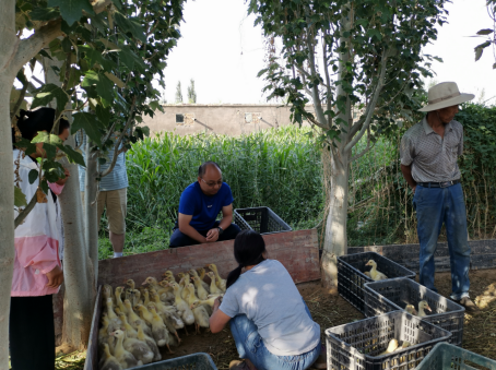 工作队针对六连特色优势,分析不同家禽养殖特点,考察农户养殖技术条件,确定了两名养殖户作为示范试点对象。自6月起,先后为他们修建养殖隔离墙600米,投资3批次鹅苗1200只,共耗资70000元。健全农户和塔里木大学家禽养殖技术专家交流渠道,采用以果园绿色饲草为主料的养殖方式,确保鹅苗病害第一时间处理解决。截至目前,试点鹅苗成活率达到85%。