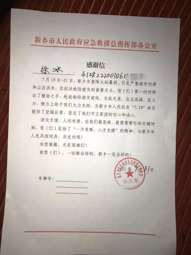 7月30日,给排水2019级2班徐冰,和志愿者们一起,把义务捐献物资送往新乡市和鹤壁淇县。他说:“在路上,我们遇见了很多外地捐赠物资的车辆,这让我们心里倍受感动。身为一名河南人,在此次洪灾中,深切体会到一方有难,八方支援,有一份力出一份力的精神。希望我们的微薄之力可以为他们带来一点点力量。”事后,徐冰还收到了一封来自新乡市人民政府应急救援总指挥部办公室的感谢信。