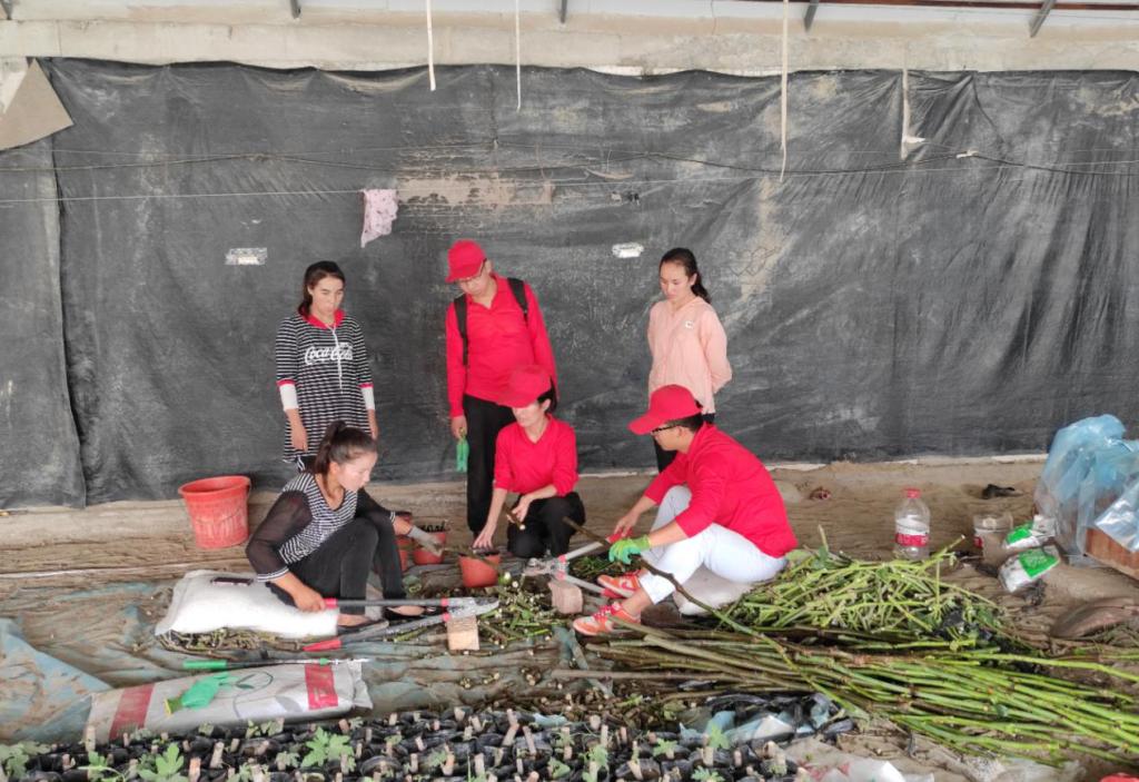 实践团在队长吾尔古丽的带领下,分别向农户讲解枝条怎么剪,怎么消毒,为什么要涂油漆,怎么涂,激素怎么配等技术要点。