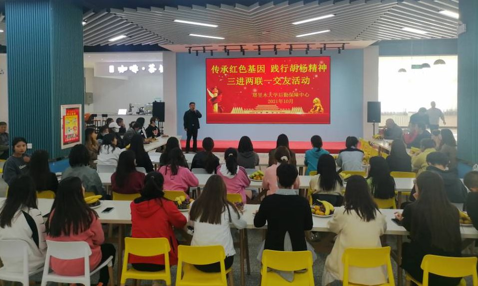 10月13日下午,后勤保障中心在学生第三食堂二楼大厅开展“传承红色基因、践行胡杨精神”民族团结联谊活。中心党总支委员、副主任王大伟,总支委员、副主任朱新保,以及全体干部职工交友学生共同参加。