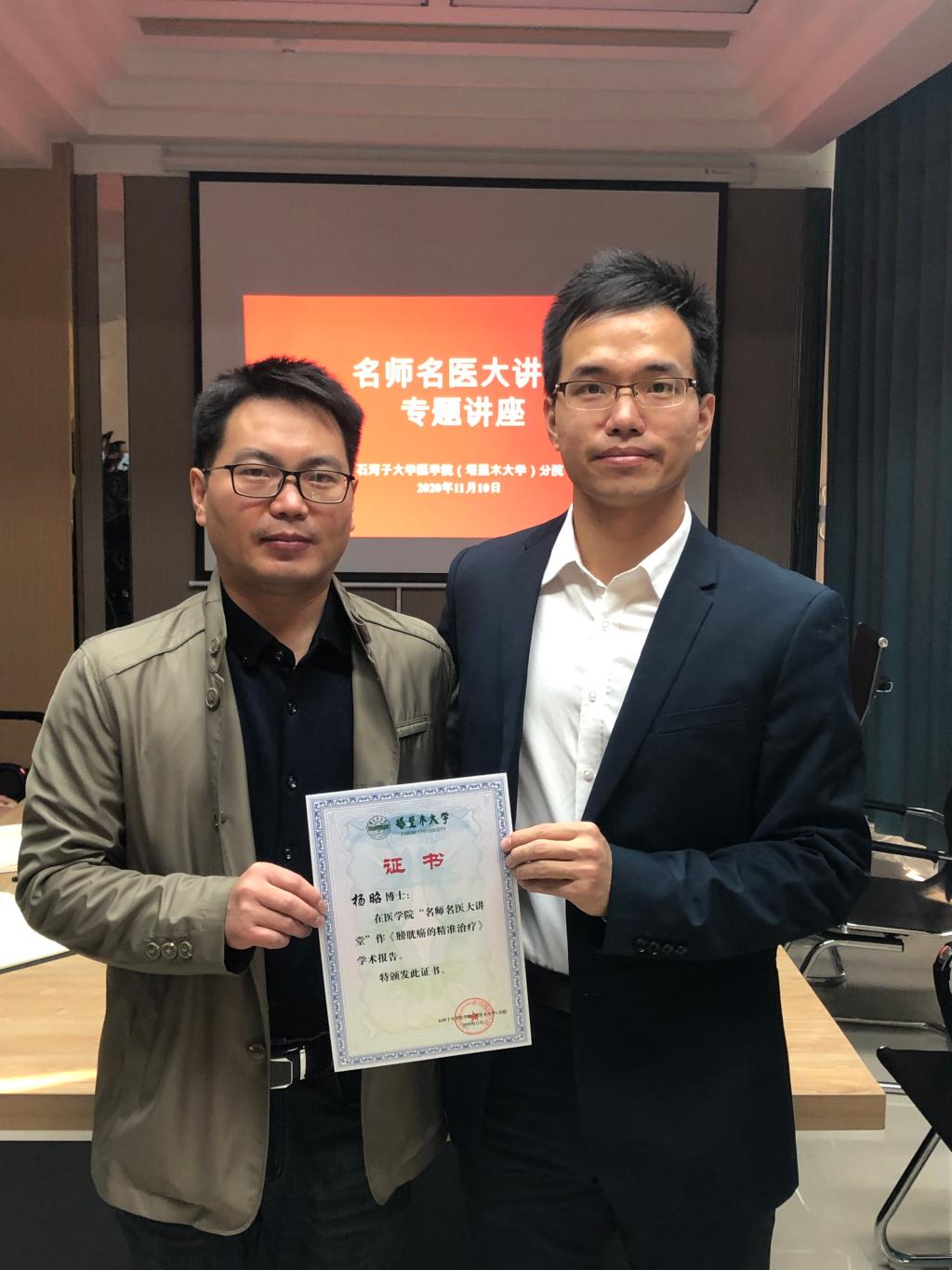 杨昭以铸牢中华民族共同体意识为主线,认真开展民族团结宣传教育和民族团结进步创建工作,积极参加三进两联一交友活动,广泛开展爱国主义、理想信念、民族团结、等方面宣传教育,切实关心帮助解决学生学习和生活中的实际困难。不把自己当做外人,自觉成为民族团结的促进者、社会稳定的维护者、合作交流的联络者、胡杨精神的传播者。他积极发挥专业特长,先后在全校范围内开展了“膀胱癌精准诊疗”名师名医大讲堂、“女性肿瘤的预防和治疗”健康知识讲座、“肿瘤干细胞与肿瘤精准治疗”学术报告和“舍与得的人生修行课:学会选择,懂得放弃”明德论坛。对学生进行学业、择业以及恋爱等方面教育,普及女性肿瘤防治知识,增强全院女教职工关爱自我、珍惜生命的意识,提高全体女教职工自我检查和肿瘤疾病预防能力。