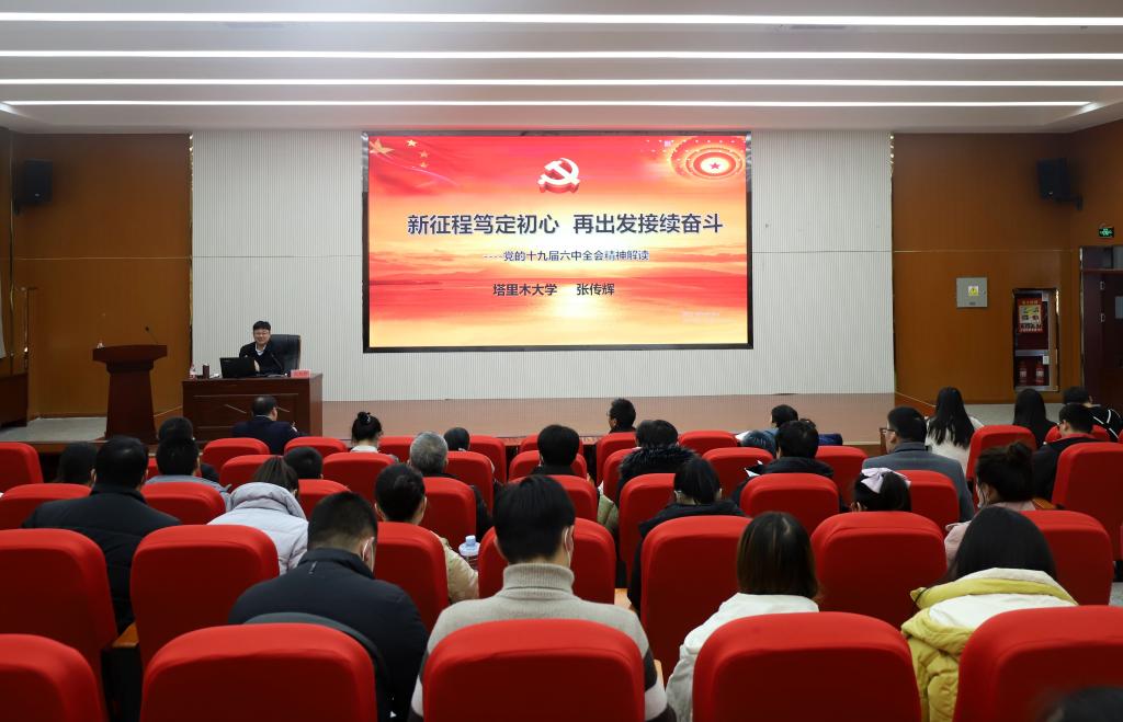 张传辉强调,要把学习贯彻全会精神作为重大政治任务,原原本本学习全会文件,读原文、悟原理,深刻领会全会提出的新思想新论断新要求,努力掌握蕴含其中的马克思主义立场观点方法,用全会精神武装头脑、统一思想、凝聚共识、坚定信心、增强斗志、指导实践、推动工作。要以学习全会精神为重点,巩固党史学习教育成果,引导广大师生坚定历史自信、增强历史主动、涵养历史思维、运用历史经验,不断深化规律性认识,践行初心使命,传承红色基因,发扬胡杨精神,全面贯彻党的教育方针,落实立德树人根本任务,扎根南疆大地办好人民满意的教育,彰显用胡杨精神育人、为兴疆固边服务的办学初心和办学特色,统筹推进学校扩大办学规模和高质量发展,为发挥兵团特殊作用,推进新疆社会稳定和长治久安,奋力谱写好中华民族伟大复兴中国梦的新疆篇章、兵团篇章,贡献塔大更大智慧和力量,以优异成绩迎接党的二十大召开。